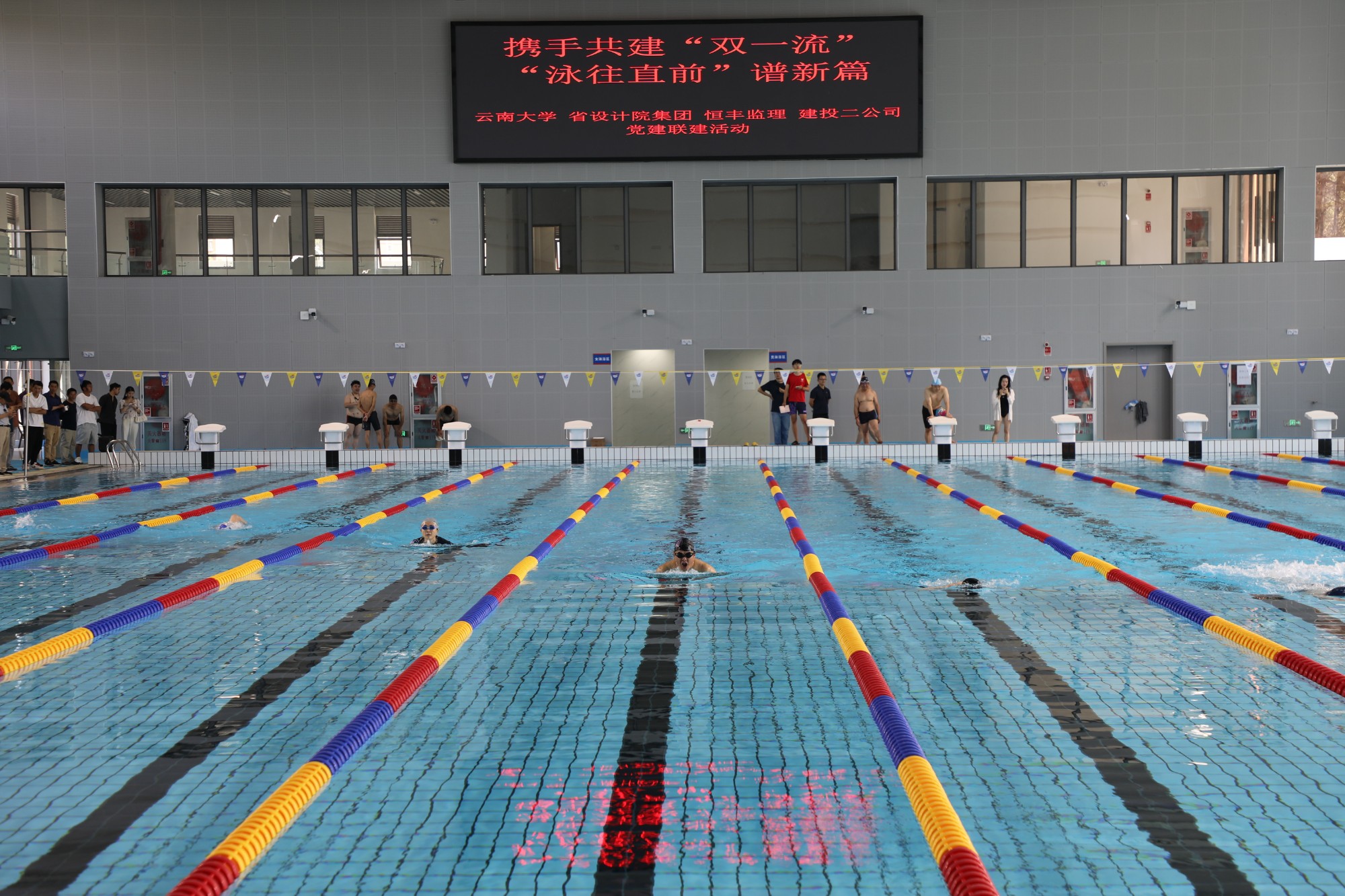6月21日下午,公司與云南大學(xué)基建處、省設(shè)計(jì)院集團(tuán)、恒豐監(jiān)理在由公司承建的云南大學(xué)呈貢校區(qū)游泳館開(kāi)展“攜手共建‘雙一流’ ‘泳往直前’譜新篇”主題黨建聯(lián)建活動(dòng)。云南省設(shè)計(jì)院集團(tuán)公司黨委副書(shū)記、副董事長(zhǎng)、總經(jīng)理李躍虹,省院集團(tuán)工會(huì)主席、二建院黨支部書(shū)記、院長(zhǎng)湛華,二建院黨支部副書(shū)記、副院長(zhǎng)許丁,云南大學(xué)基建處處長(zhǎng)余暉、副處長(zhǎng)柳國(guó)清、副處長(zhǎng)方云,云南恒豐建設(shè)咨詢管理有限公司項(xiàng)目部總監(jiān)鄒榮,公司黨委副書(shū)記、董事長(zhǎng)陳定華,黨委委員、副總經(jīng)理晏迷出席活動(dòng)。