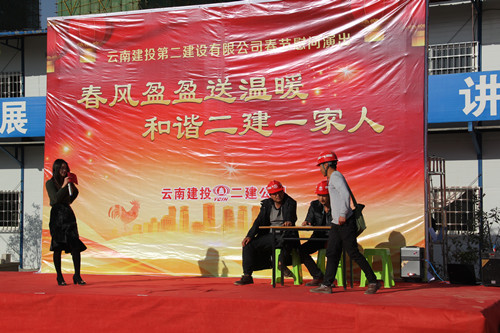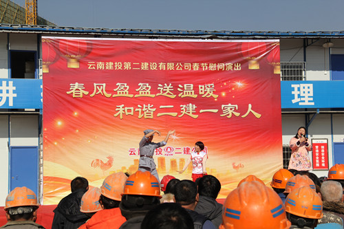 “春風(fēng)盈盈送溫暖、和諧二建一家人?!?1月14日至15日,公司團(tuán)委組織公司文藝團(tuán)隊(duì)到昭通市昭陽(yáng)區(qū)2013年保障房項(xiàng)目開(kāi)展春節(jié)慰問(wèn)演出,為項(xiàng)目一線的職工和工友們送去新春佳節(jié)的祝福。