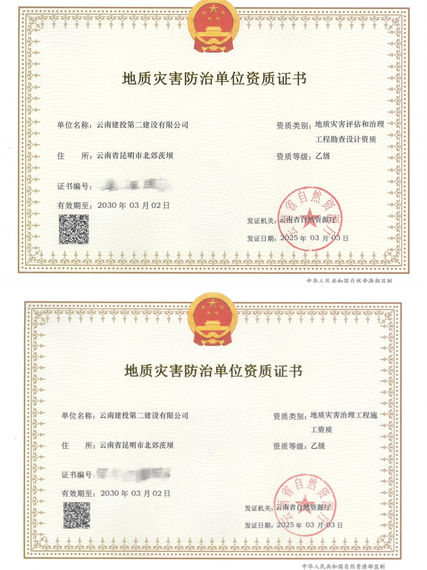 近日,經(jīng)云南省自然資源主管部門(mén)審查批準(zhǔn),公司獲得地質(zhì)災(zāi)害治理工程施工乙級(jí)資質(zhì)及地質(zhì)災(zāi)害評(píng)估和治理工程勘察設(shè)計(jì)乙級(jí)資質(zhì)。