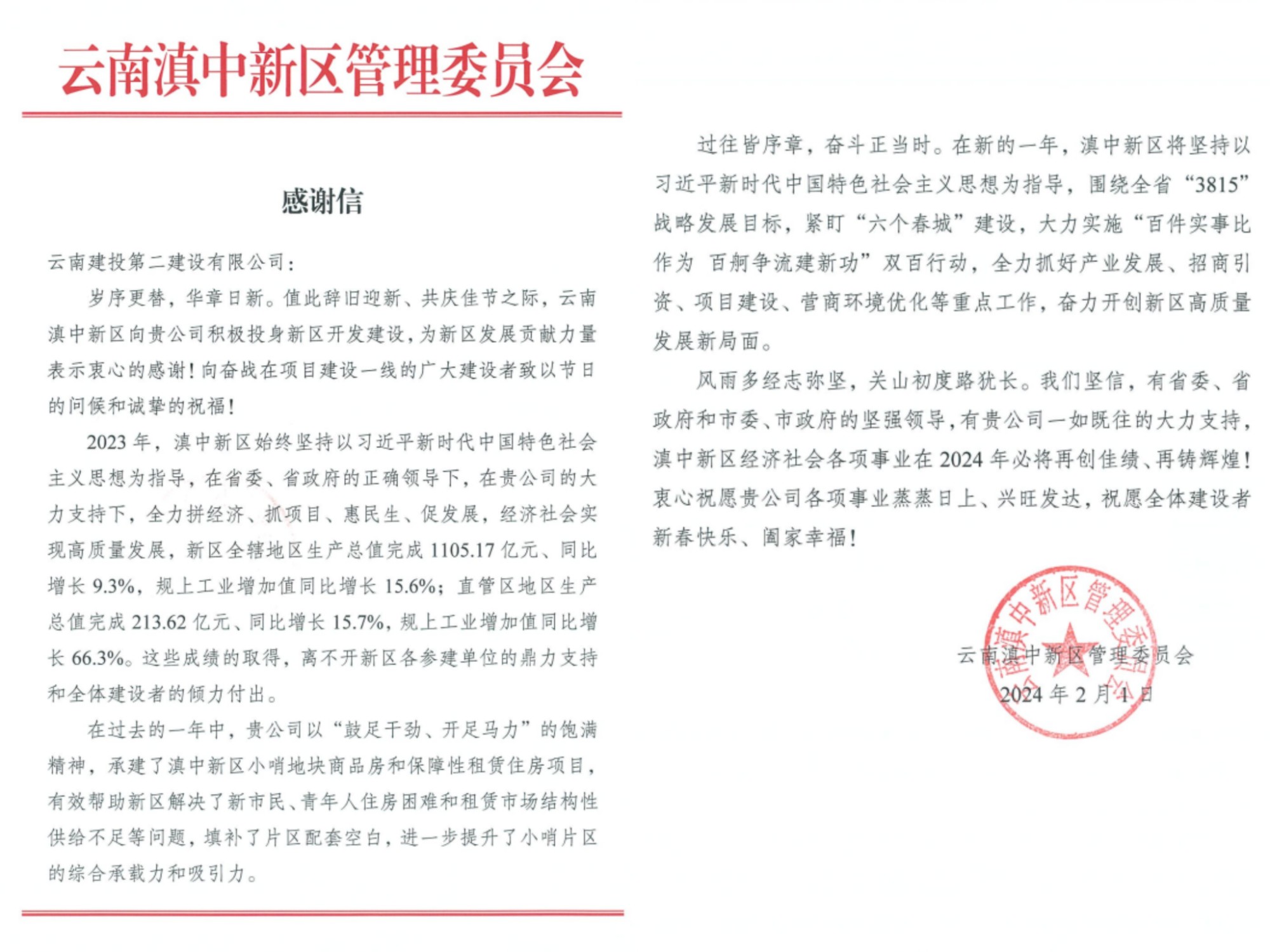 近日,公司收到一封來自云南滇中新區(qū)管理委員會(huì)的感謝信。信中感謝了公司積極投入新區(qū)開發(fā)建設(shè),為新區(qū)發(fā)展貢獻(xiàn)了力量,并向奮戰(zhàn)在項(xiàng)目建設(shè)一線的建設(shè)者致以節(jié)日的問候和誠(chéng)摯的祝福。