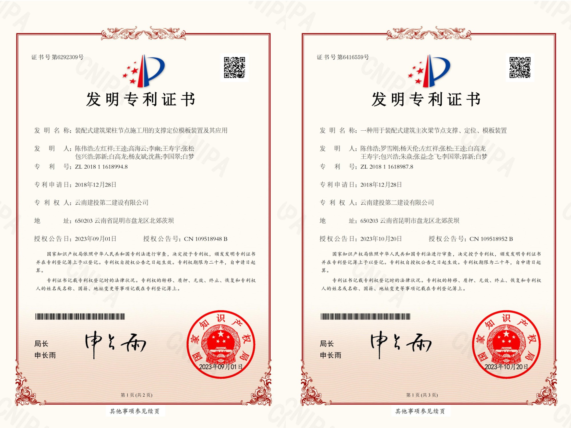 2023年,公司申報的《一種疊合板鋼筋擺放架》、《一種用于裝配式建筑主次梁節(jié)點支撐、定位、模板裝置》、《裝配式建筑梁柱節(jié)點施工用的支撐定位模板裝置及其應(yīng)用》、《一種電梯施工平臺及其控制方法》、《一種便攜式建筑施工用激光投線儀》、《一種用于裝配式建筑的多功能支撐頂托裝置》等6項發(fā)明專利獲得國家知識產(chǎn)權(quán)局授權(quán)。