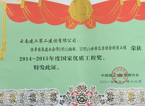 12月18日,在北京舉行的2014—2015年度創(chuàng)建國(guó)家優(yōu)質(zhì)工程總結(jié)表彰大會(huì)上,由公司參建的會(huì)澤馳宏鋅鍺6萬(wàn)t/a粗鉛、10萬(wàn)t/a電鋅及渣綜合利用工程榮獲2014—2015年度“國(guó)家優(yōu)質(zhì)工程銀質(zhì)獎(jiǎng)”,公司董事長(zhǎng)陳定華獲得2014—2015年度“國(guó)家優(yōu)質(zhì)工程獎(jiǎng)突出貢獻(xiàn)者”稱號(hào)。